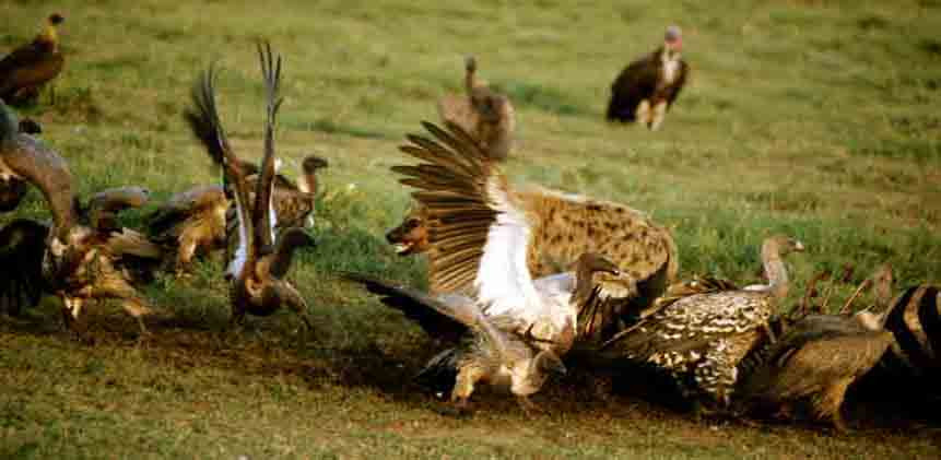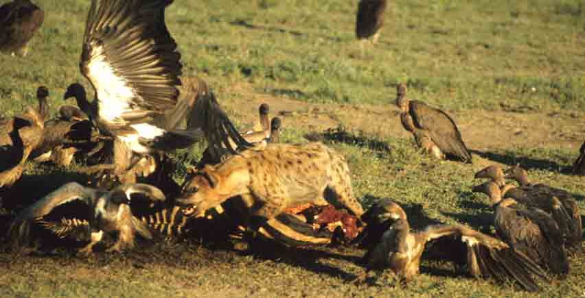 Spotted Hyena with vultures-1st image: While the young hyena chases the whitebacked vultures on his right, the vultures behind him feed on the carcass. The vultures are emboldened because the hyena is a lone youngster. This zebra was probably killed by lions who fed well and left the remains. [Serengeti, Tan].