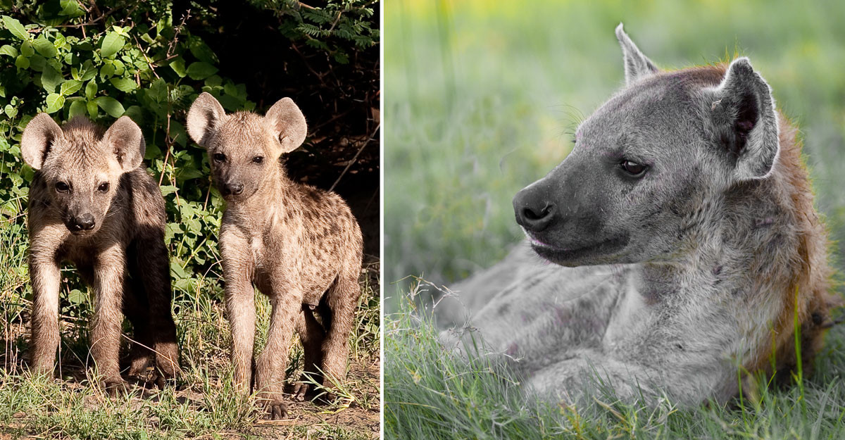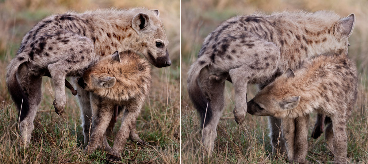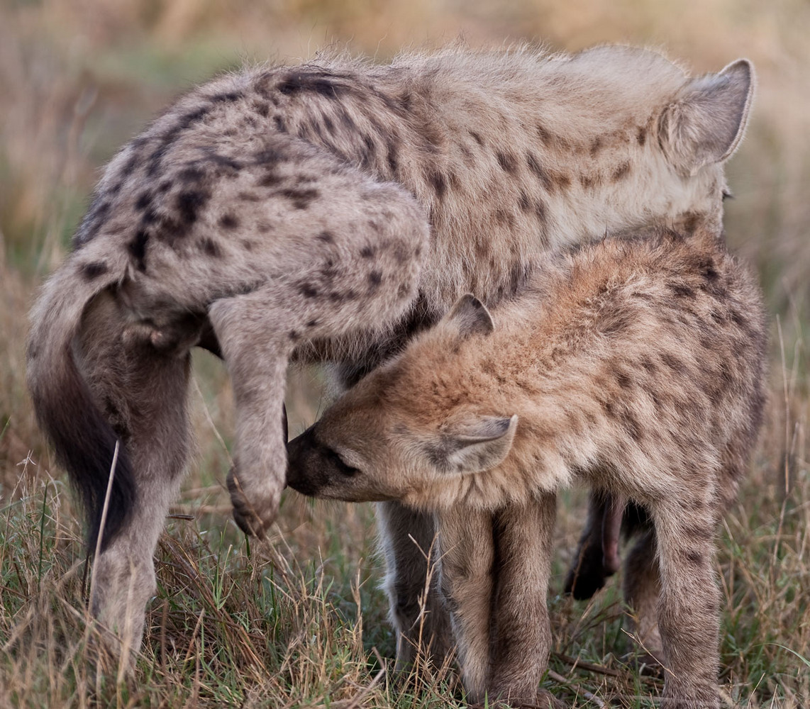 The Spotted Hyena have a custom which requires a junior male member of a family to greet an older or important male member of the clan by performing fellatio on him.This and the next image depict that act. [Botswana].