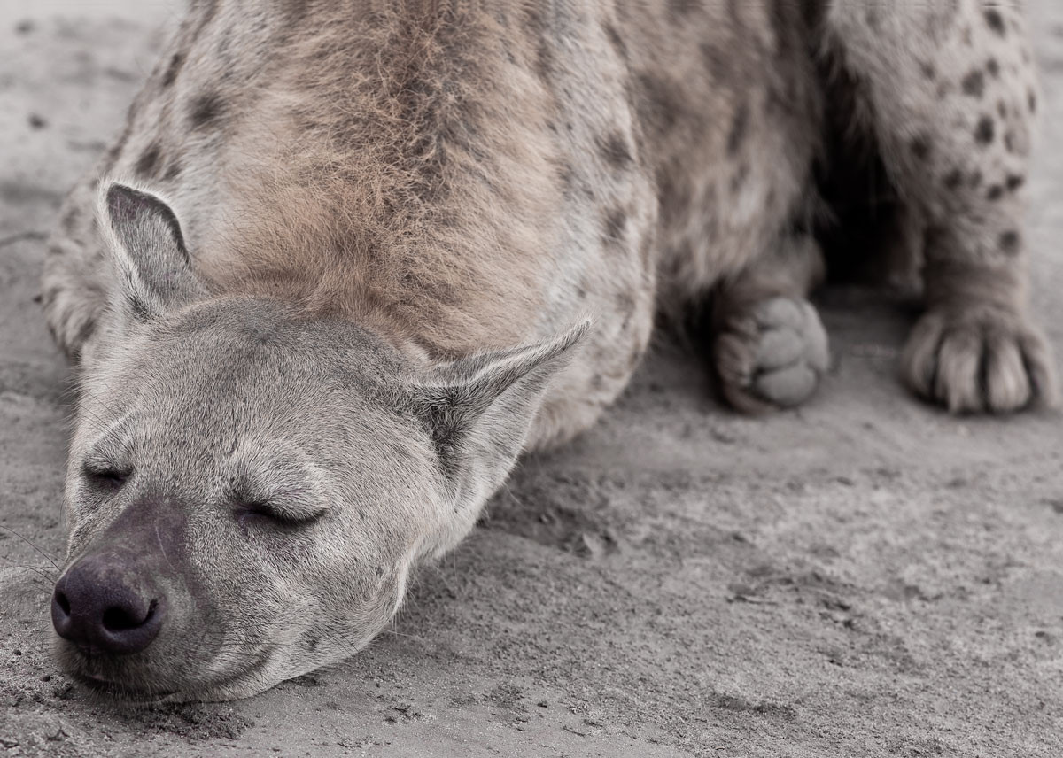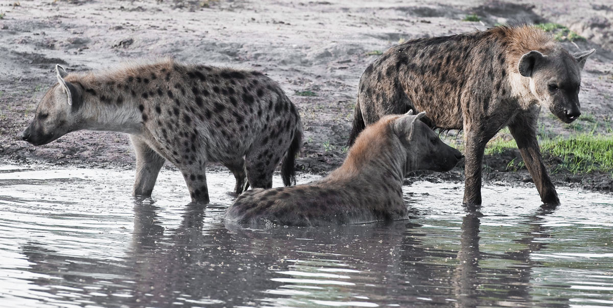 Hyena and mudbath: This is the same hyena as in the preceding image. Our approach disturbed it, causing it reluctantly to abandon the nice bath. [Ngorogora, Tanzania].