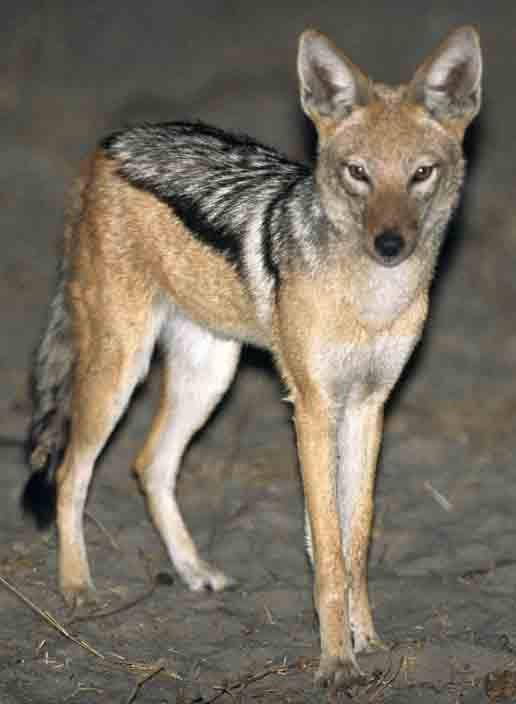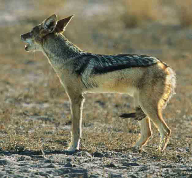 This is the same Blackbacked Jackel male as in the previous image. He was howling because about 75 feet, in the direction he was pointing, was a large male leopard. [The leopard was present seeking to mate again with a female leopard with which he had previously mated--See 'Leopards']. [Deception Valley, Botswana].