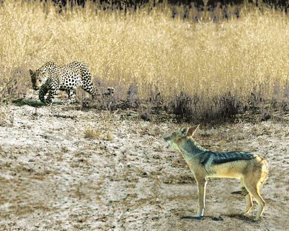 This is an unusual confrontation between a male Blackbacked Jackel and an adult male Leopard.The Jackel is howling to warn every other creature in the vicinity that a major predator is around. I am sure that the leopard would have loved to catch and crush this little loud-mouth, but the latter is too quick and fast for that to happen. [Deception Valley, Botswana].