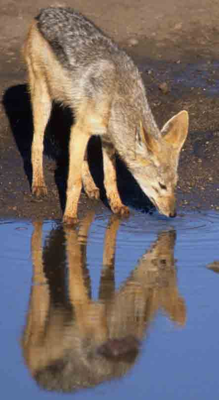 Blackbacked Jackel drinking (with reflection): A beautiful close-up of an adult male. [Serengeti, Tanzania].