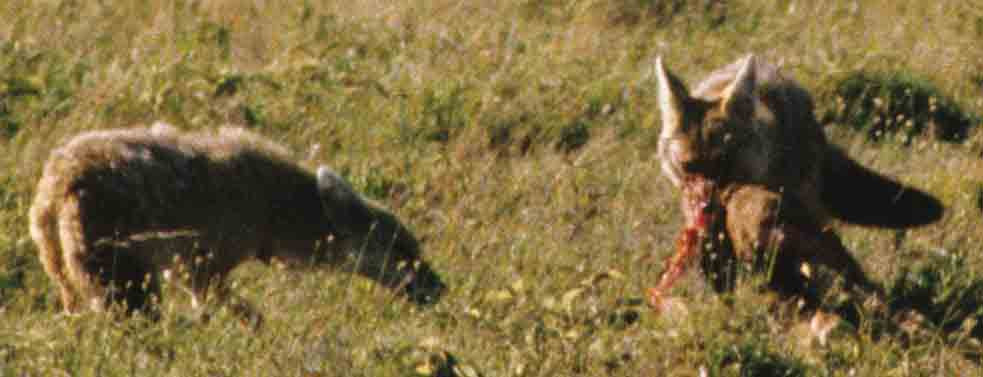 Blackbacked Jackel eating: A white-backed vulture patiently waits as a jackel licks his chops, having glutted himself on a Thompson's Gazelle fawn that he had found in the tall grass (where gazelle mothers customarily hide their newborn). The vulture sees that the jackel has already stuffed itself and might soon leave the carcass to avoid a confrontation with other larger carnivores. [Serengeti, Tanzania].