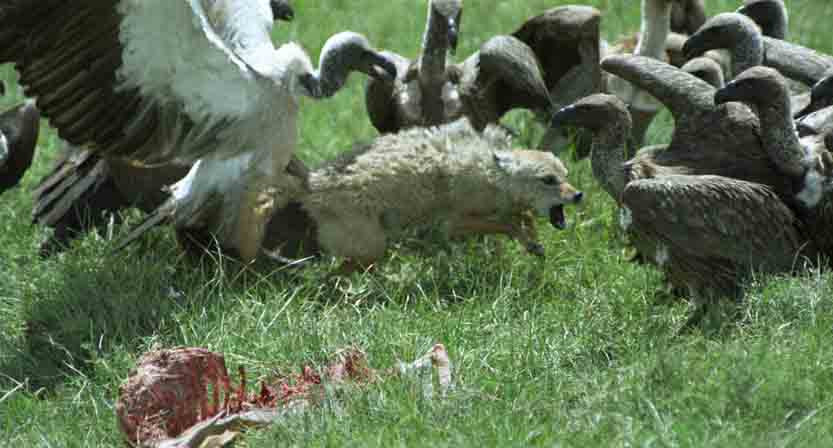 Blackbacked Jackel chases vultures off carcass. The same event as in the previous image. The vulture in the upper L, and behind the Jackel are whitebacked vultures. [Serengeti, Tanzania].