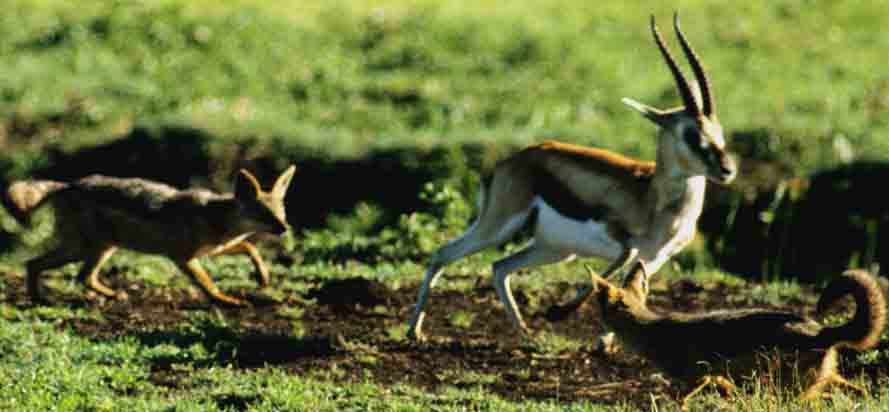 Blackbacked Jackels & Thompson's Gazelle-Image 3: When a second Jackel appears, the Thompson's Gazelle decides its time to leave. (I have seen two jackels pull down and kill a female impala of about the same size, but they could have seriously hurt him: one bite of their sharp teeth on his hind leg tendon could cripple him, and make him an easy target for other carnivores. [Serengeti, Tan].