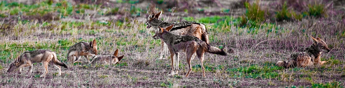 Blackbacked Jackel mother with her near grown 3 kits-1st Image: In the next 2 images she watches her three subadult kits playing among themselves. Early morning. [Serengeti, Tanzania].