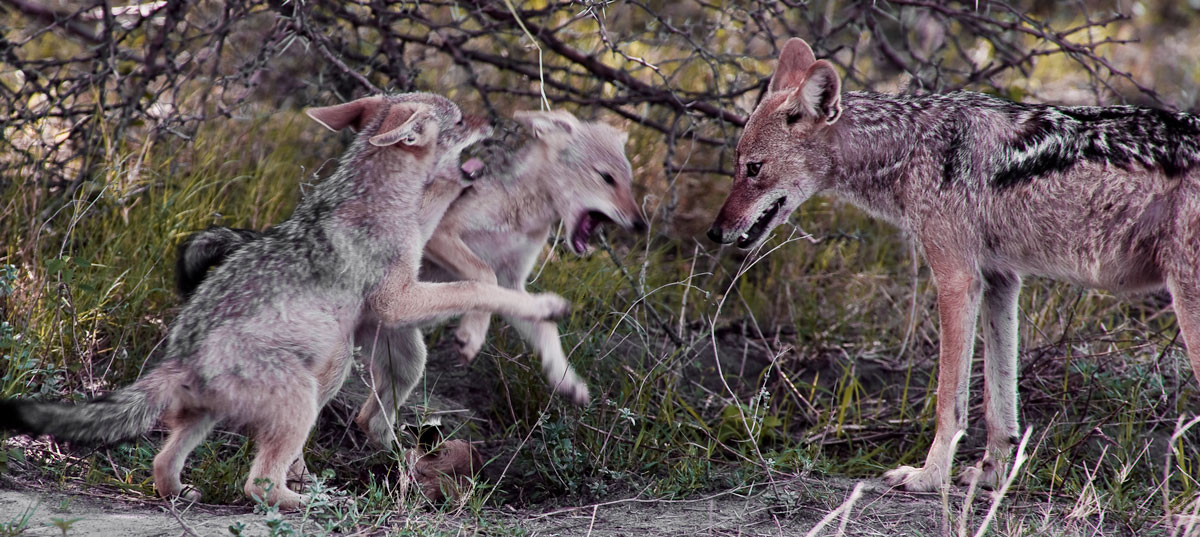 Blackbacked Jackal mother and her 3 Kits-2nd image: Another view of the 3 kits playfully nipping with each other. (Please see caption for previous image). [Serengeti, Tanzania].