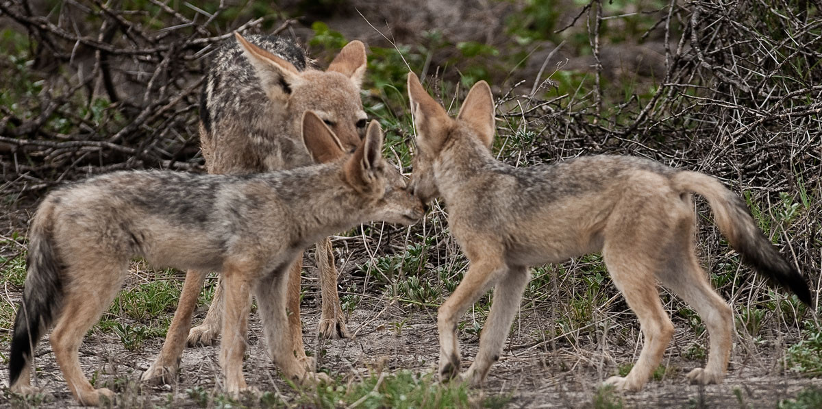 Blackbacked Jackal mother and her 3 Kits-3rd Image: One of the kits nuzzles its mother for a little affection. (Please see captions for the 2 previous images). [Serengeti, Tanzania].
