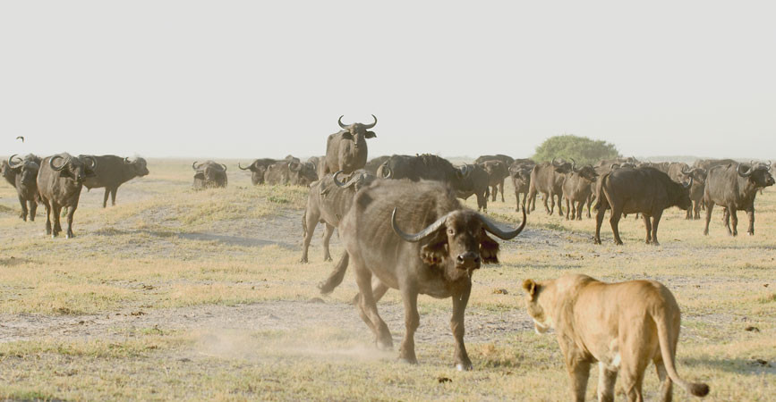 The Lioness walks closer, and more Buffalo bulls gather behind her. [Duba Plains, Botswana].