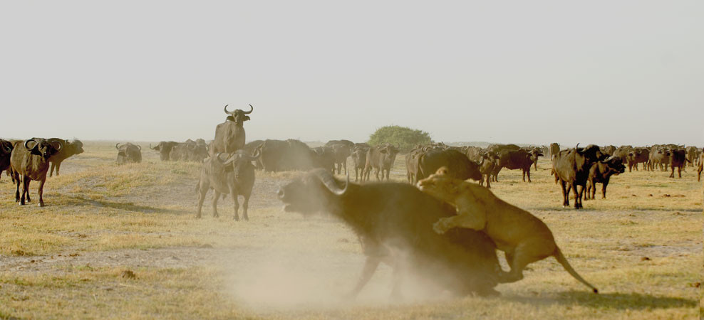 A Lioness jumps on the old buffalo's back. (An adult lioness like this one probably weighs around 250 pounds). A big load for the female buffalo to support! Note that the lioness, in addition to using her prehensile claws, uses her jaws and teeth to grab the skin and fur along the spine to secure her grip. Still no action from the bulls! [Duba Plains, Botswana].