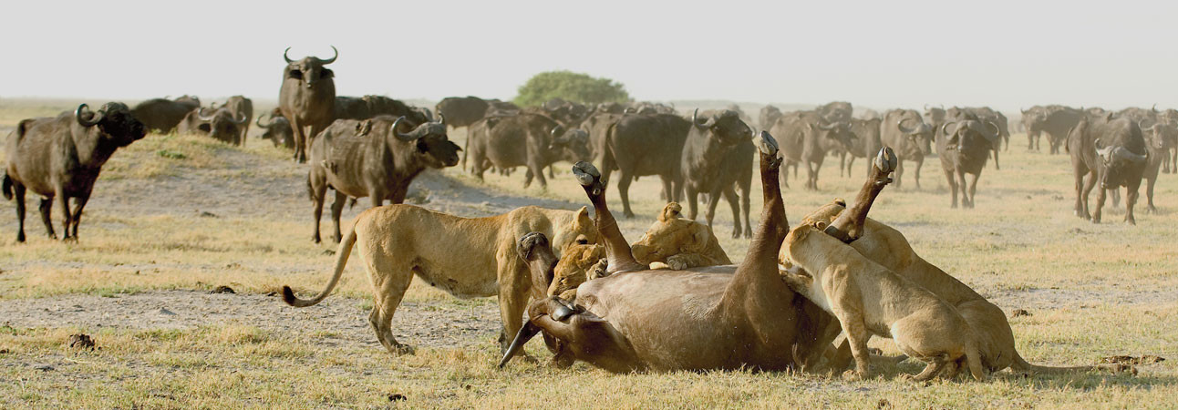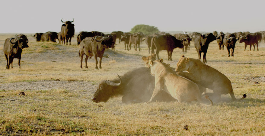 A second Lioness climbs onto the buffalo's back: Still no reaction from the bulls. This is strange, because 5 minutes ago, they were nudging and surrounding her to keep her close to them!. But the situation has changed! Seeing that the lionesses are about to have the buffalo on the ground, the chance for the bulls to intervene successfully has been lost! And they might have been deterred by having seen or smelled the other lionesses and lions nearby? The buffalo is constantly crying out since the lionesses first seized her. [Duba Plains, Botswana].