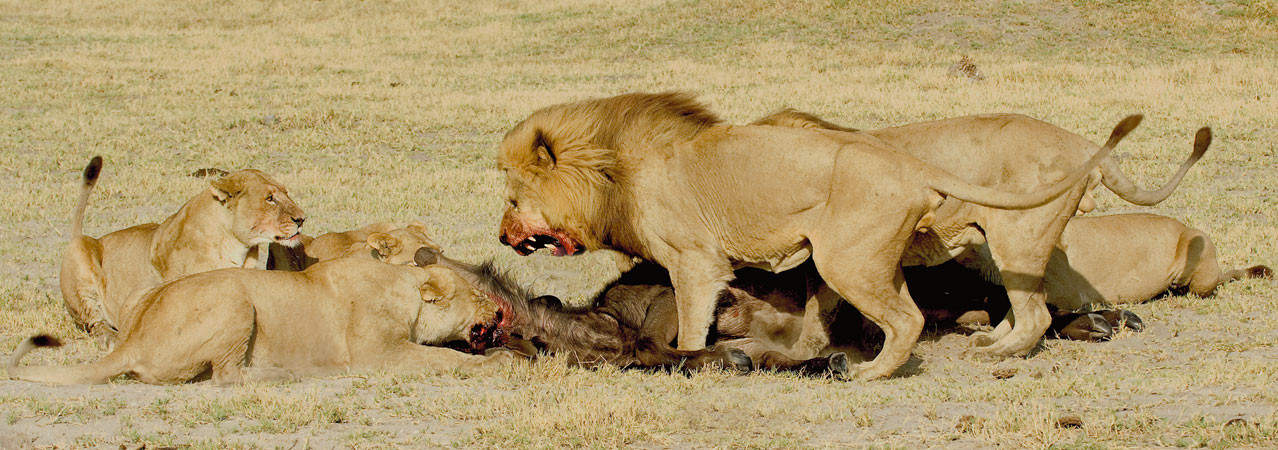 There were five Lionesses: one Lioness is crushing the buffalo's throat, while the others are working to open the abdomen. [Duba Plains, Botswana].