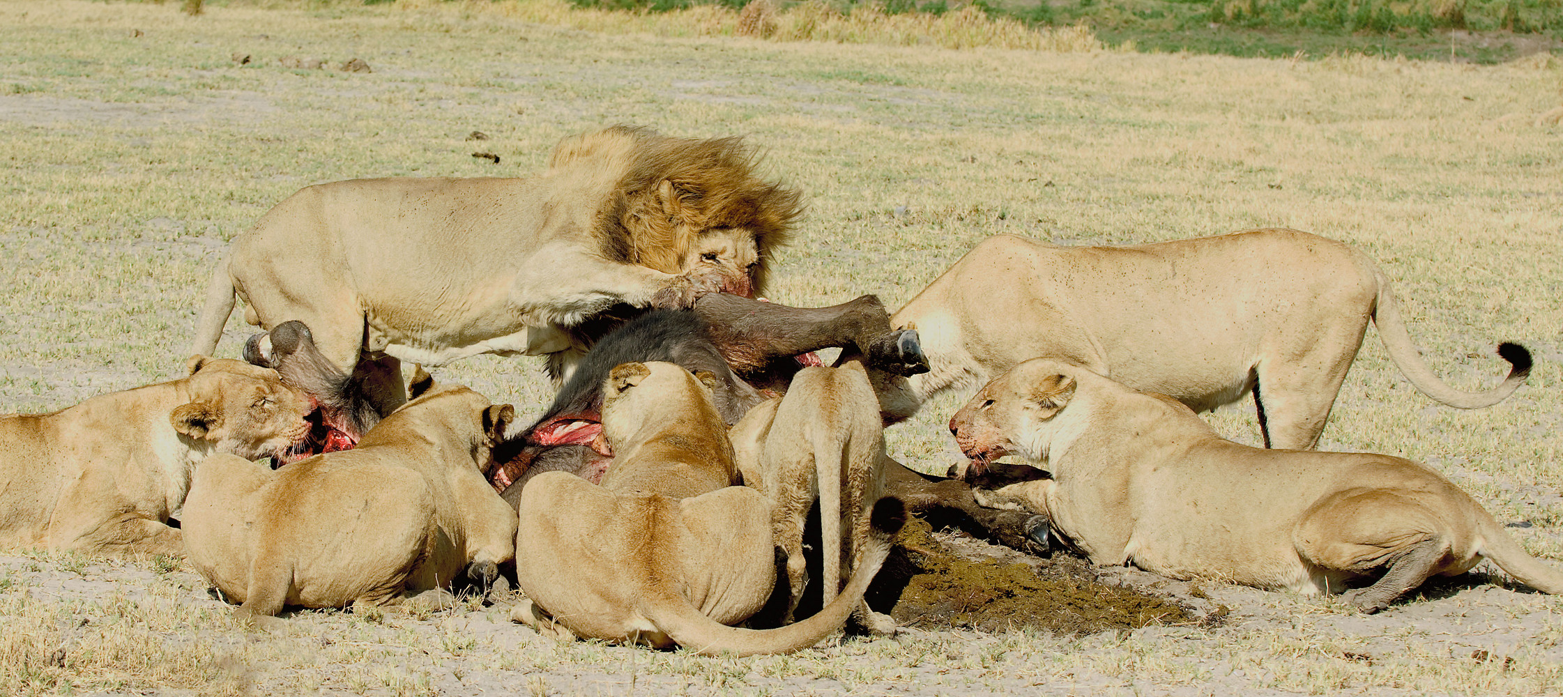 All the pride adults are feeding: Note the intestinal contents on the ground, which means that the lionesses had succeeded in broaching the abdominal wall and had removed the intestines to access the muscle of the abdominal wall, its contents, and the chest contents. The lioness at the buffie's head has removed the soft tissue under the jaw to access the tongue--a delicacy! This whole event of the take-down lasted about 5 minutes. After I took these pictures, we left the scene, but returned in mid-afternoon. There remained only the rib-cage and the long bones, with some tags of meat! This big lion pride requires a large-sized kill about every 3 days. There are undoubtedly cubs and juveniles 'back home' to be fed! Feeding such a large pride requires a large prey. It is common for a large pride of lions to keep in easy reach of a large buffalo herd. [Duba Plains, Botswana].