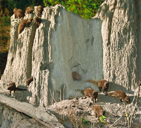 A Dwarf Mongoose colony has converted an abandoned termite mound into a multi-exit burrow for 20-30 individuals. This mongoose species is the smallest carnivore in Africa. It only weighs about one-half pound. It will eat carrion, insects, and small rodents. [Moremi NP, Botswana].