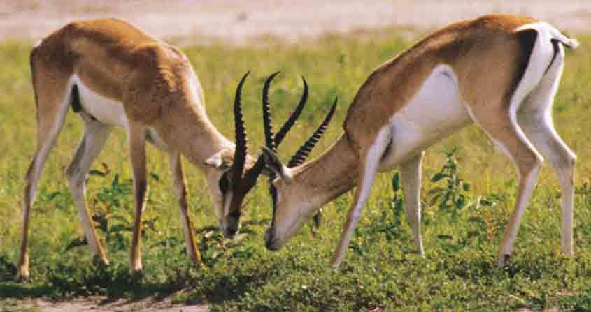 A lateral view of an adult male Grant's Gazelle Note the black stripe on the haunch. Because of its presence on both buttocks, safari guests help their memory of this species with the saying: "Grants wear pants". Only the bucks bear horns. [Serengeti, Tanzania].