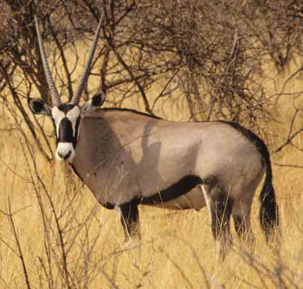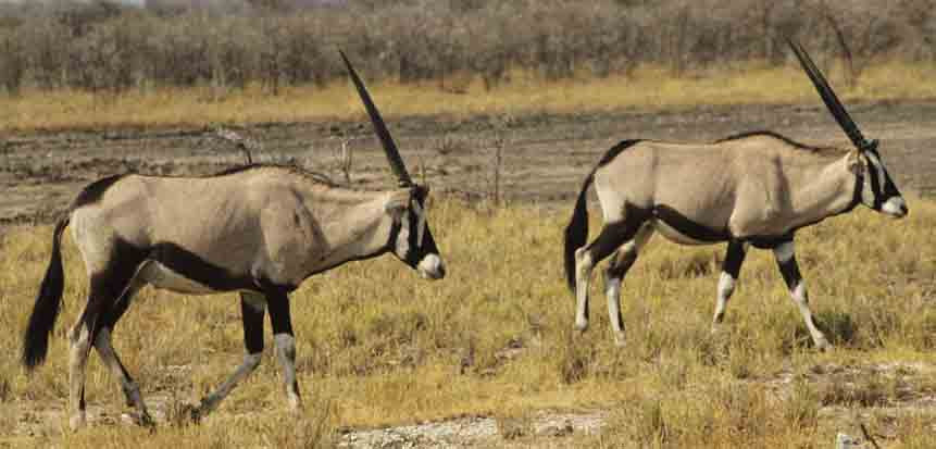 This is the herd of the two fighting Gemsbocks gazella. A southern african gemsbok (Oryx gazella) is very similar to the Beisa Oryx in East Africa. Both are very handsome animals. The male can weigh over 550 lbs., and is about 4 ft. tall at the shoulder. Both sexes bear horns.[Central Kalahari, Botswana].