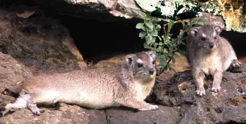 A female Rock Hyrax with her youngster on a small kopje It is not possible to sex these animals grossly, because the testes are internal. There is another species: The Tree Hyrax, whose fur is finer and are said to have a better disposition. A Hyrax is a small animal (a male weighs about 10 lbs.). It is a very distant relative of the elephant. [Masai Mara, Kenya].