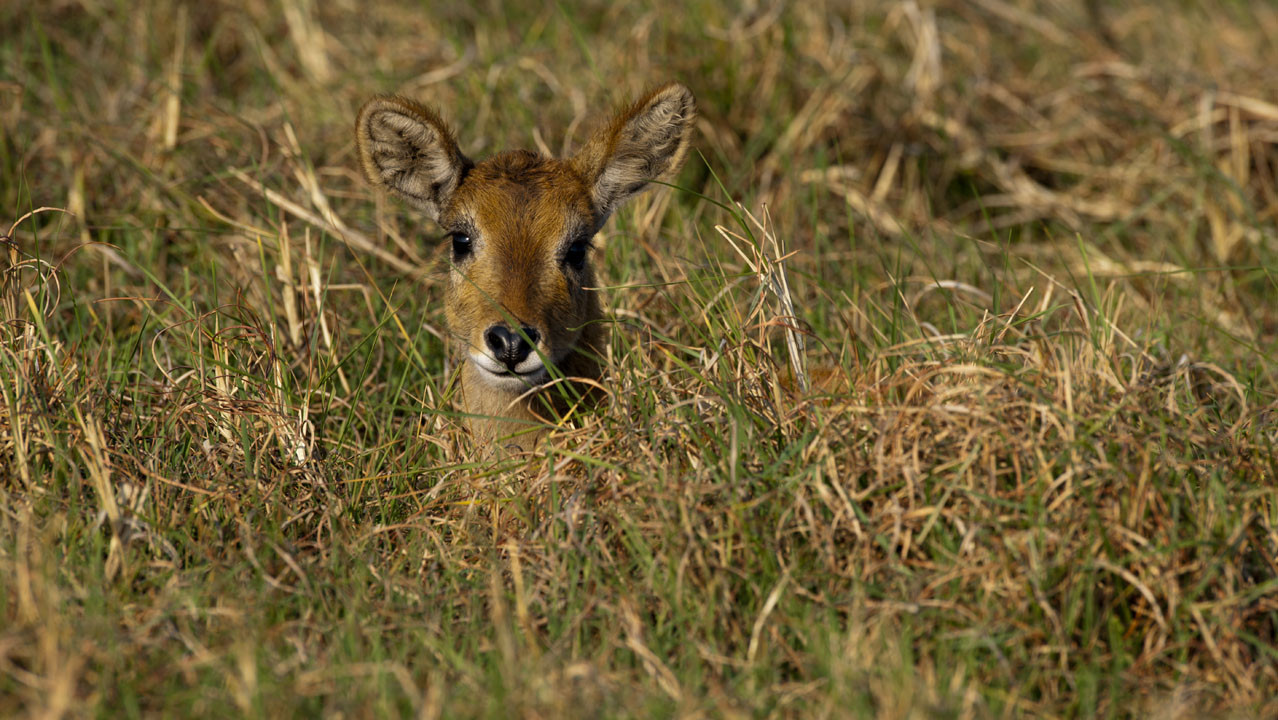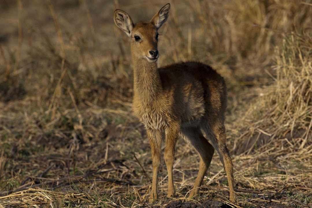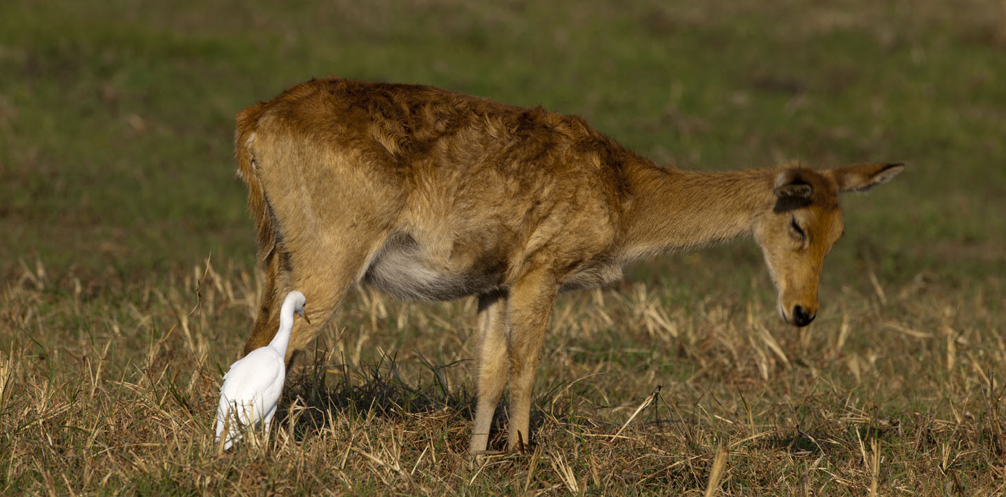 An adult male Puku about to scurry into the woodlands. [Busanga Plains, Zambia].