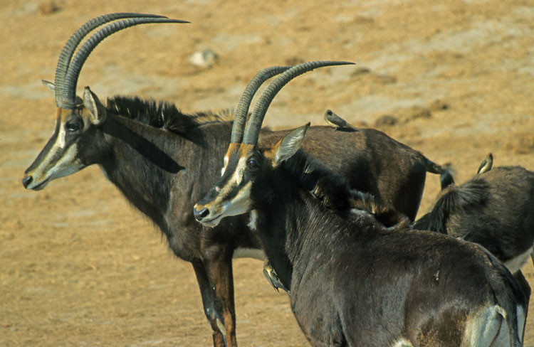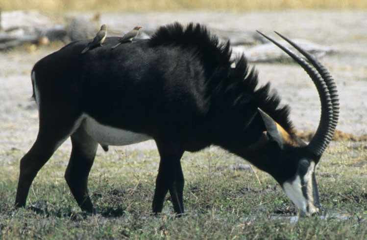 An average adult Sable Antelope male weighs about 525 lbs., but I believe that this old buck may be heavier.The horns sweeping back over his neck are a very effective weapon. In a fight, he will kneel down, turn his head sideways, and use a sweeping motion like a scythe to impale his adversary. This species has a facemask similar to the roan antelope. Both sexes have horns. The red-billed oxpeckers are ever-present on this species also. [Hwange NP, Zimbabwe].