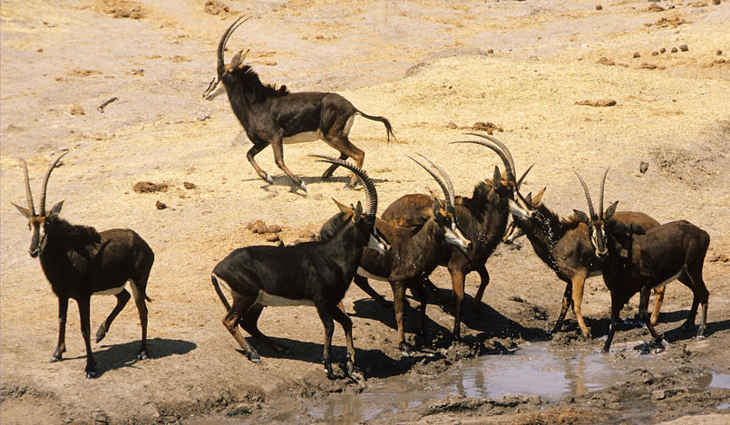 All those at the water drinking are adult female Sable Antelope. The females may be more brownish (but turn blacker when they become older). Both sexes bear horns, but the female's are thinner and do not develop the marked posterior curvature. [Mussima Dam, Zimbabwe].