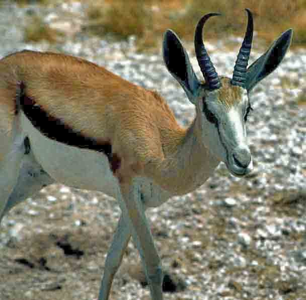 Springbok are the national animal of Namibia. They have the black slash across their sides but it is not as steeply angled as with the Thompson's Gazelle in East Africa, and this species is twice the size. (There are no Thompson's Gazelles in Southern Africa). Both sexes have horns, but the females' are thinner, shorter, & straighter. This is an adult male. [Kamutoni, Namibia].