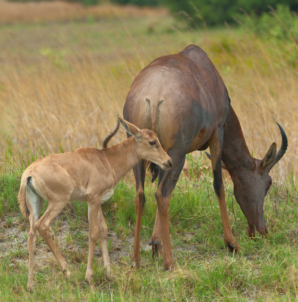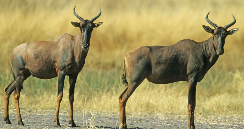 The Tsessebe of Southern Africa and the Topi of East Africa are the swiftest runners of the antelopes. These two species are related. Both have the powerful shoulder muscles & the black patches on their shoulders and nose.These are a pair, the female is in front. Both sexes bear horns. [Chobe NP, Botswana].