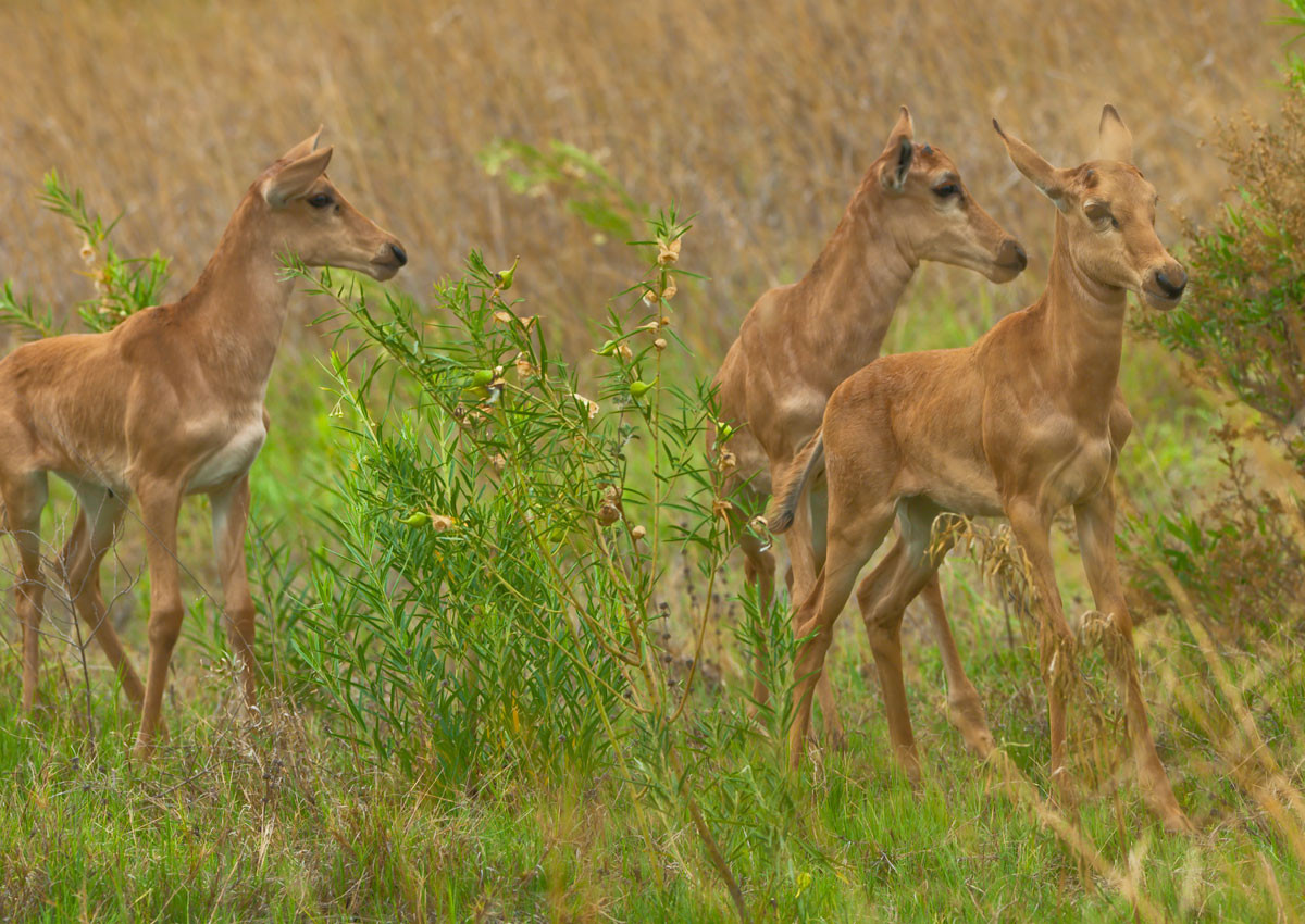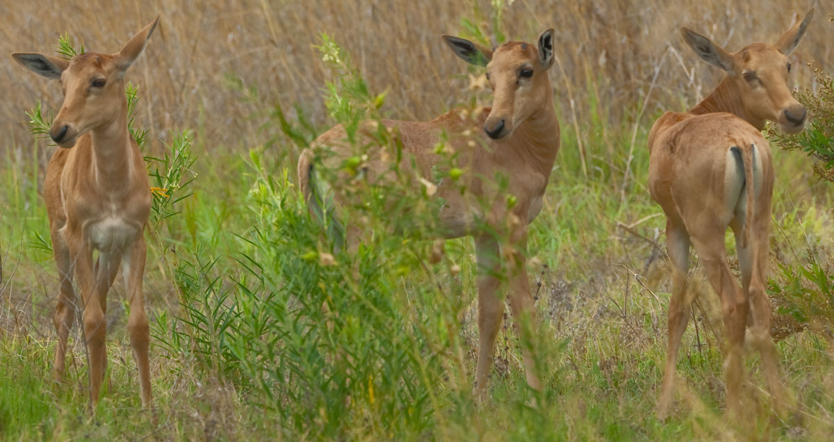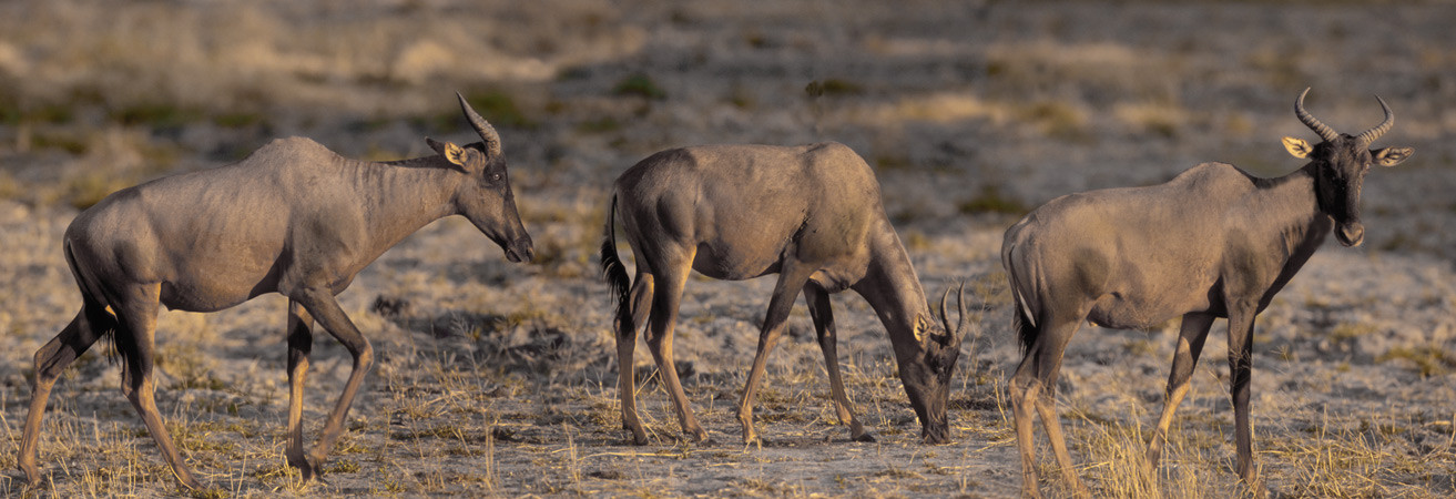 Tsessebe threesome: (L>R: male, juvenile, female). Note the difference in the horn thickness at the base--the male's (at the rear) is heavier. [Chobe NP, Botswana].