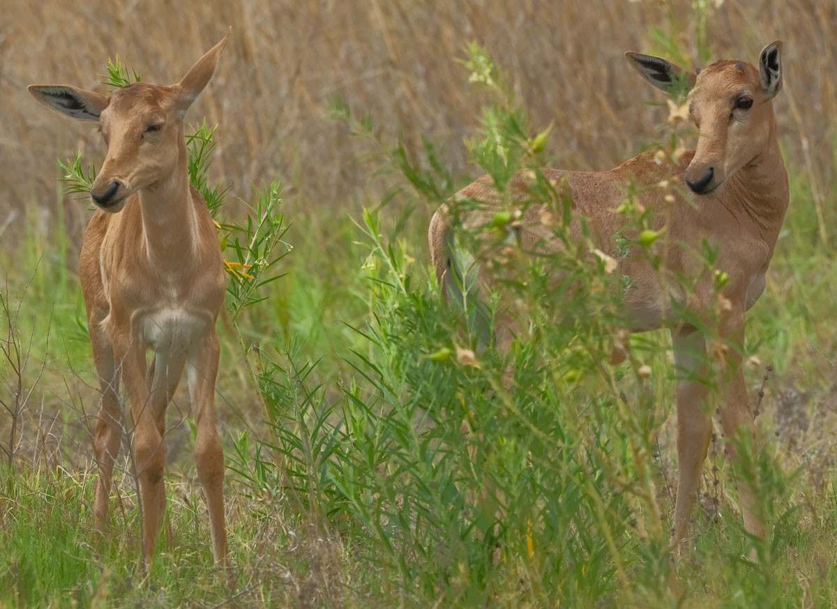 Tsessebe youngsters play-fighting. They have lighter skin-color, and only beginning horn-development. [Chobe NP, Botswana].