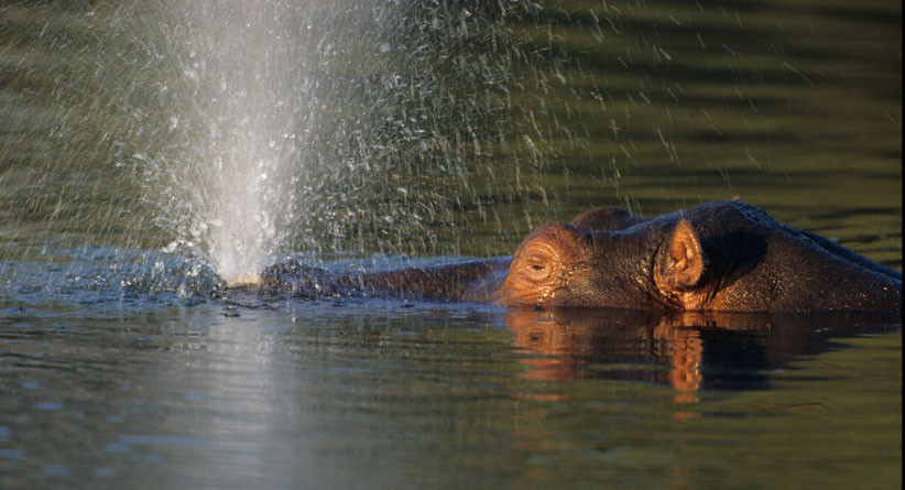 A Hippopotamus bull, upon resurfacing, blowing out the water from his nose. [Sabi Sabi (Marine Camp), S. Africa].