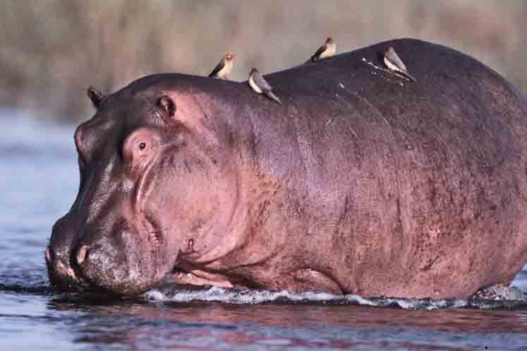 This Hippo is besieged by red-billed oxpeckers as soon as he emerges from the water. The birds seek the insects feeding in the cracks of the hippo's thick skin. They do not injure the host. Actually, they may do the hippo a service by removing the irritating insects feeding in the cracks of the skin. The birds' sharp-pointed bills probably do hurt. [S. Luangwa NP, Zambia].