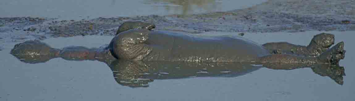 Hippopotamus doing flips-1st Image on his back: We arrived at the hide early one morning to find a hippo lying on his back "A dead hippo, I exclaimed!" A couple minutes later, the 'dead' hippo suddenly righted himself. Ten minutes later, he again turned onto his back and remained for 4-5 minutes with his head under water. He kept cycling like this until the sun went down. Switching back and forth had a purpose: he was preventing his skin from drying out & cracking from the hot sun. The water wasn't deep enough for him to submerge his whole body at the same time. [Masuma, Hwange NP, Zimbabwe].