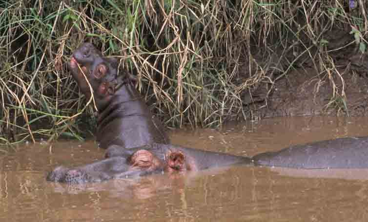 Another view of the mother Hippo and cub. The mother is very protective of her cub. We watched her sally forth and chase off all other hippos (males and females) as they entered her territory enroute up the river. [Mara River, Kenya].