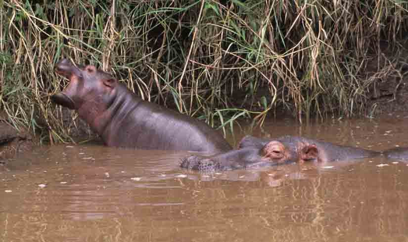 Hippopotamus bulls chalenging each other This and the next image illustrate a minor confrontation between two bulls. One bull (R) is the resident of this area of the river. He's just informing the other (L), who is just passing through, whose territory he's in. There will be no fight and no injury incurred. They both know that the 8-inch incisors could inflict serious--even fatal--wounds. {Mara River, Kenya].