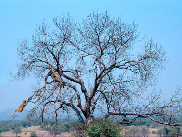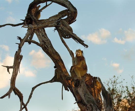 The older, larger baboon sitting on the branch has chased the younger one out onto a small branch. This was the culmination of a chase in which the bigger fellow wanted to punish physically the smaller baboon for something he had done to him. The two held their positions some 15 minutes before the larger one, tired of the game, abandoned the pursuit. [South Luangwa NP, Zambia].