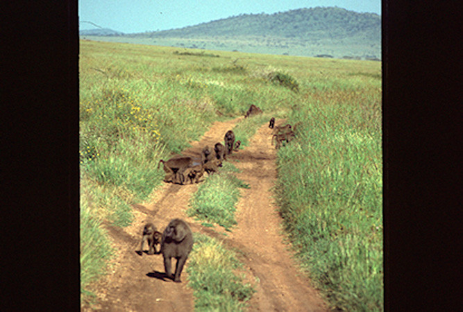One would think that the baboon troop walking down this road would be very vulnerable to predation by lions or a group of hyenas. The alfa male in the front seems not to be worried. He has a couple of mature, senior fellows (like the one in the previous image), bringing up the rear. The large male baboon is a very tough, fearless animal who considers his being chosen for this role an honor, and it gives him high rank in the troop. Two of these full-grown fellows, with their large canine teeth and strong jaws, could inflict serious injuries to a lioness. [Seronara, Tanzania].
