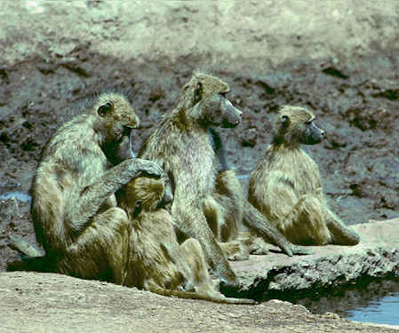 A family group of baboons rest beside the water. One of the females grooms a younger sibling. [Hwange NP, Zimbabwe].