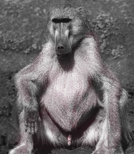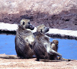 A large male baboon relaxing on the bank of the stream. [Big Tom's, Hwange NP, Zimbabwe].