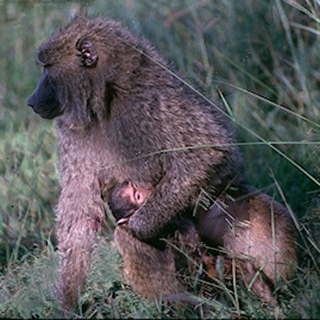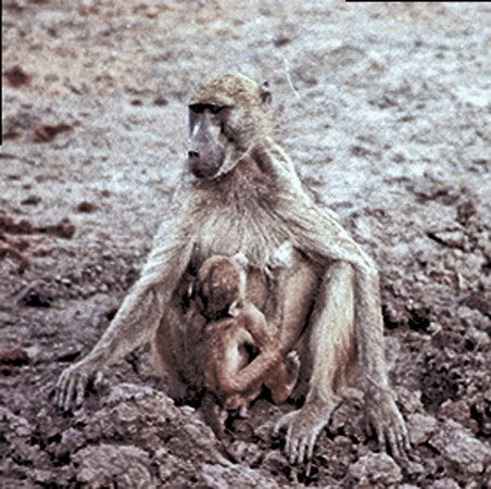 A baby baboon of about the same age as the one in the previous image (2-3 months) waiting patiently to get back in its mother's arms. This is the same baby as the one being carried by its mother in the previous image.The baby has really not been left alone, she was only a few feet away. [Seronara, Serengeti, Tanzania].