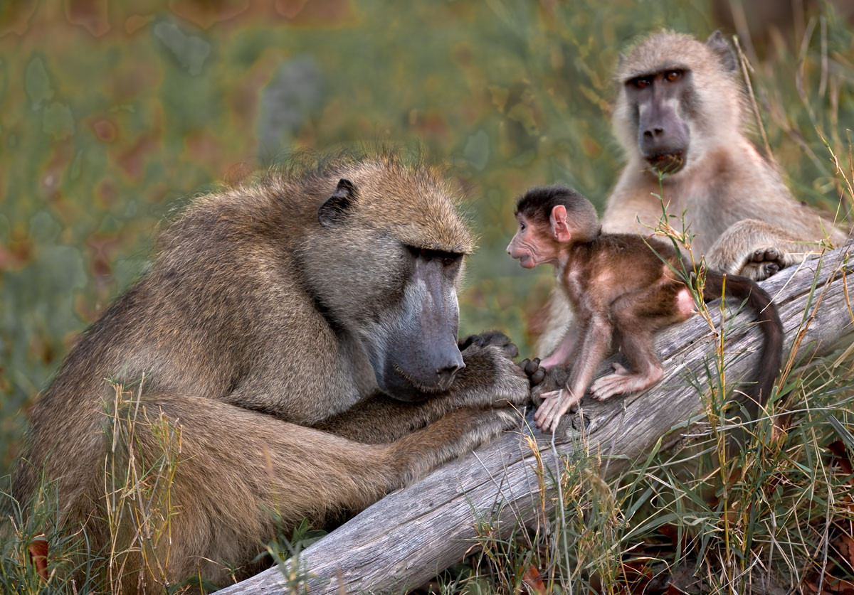 Infant Chacma Baboon with it two parents. The big male playfully growls at the baby who then scampers into its mother's arms. [Botswana].