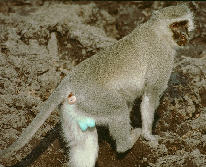 Adult male trying to steal food from tourists at a recreation area. Note again the blue scrotum threat symbol readily available should he need it to discourage another male. [Zimbabwe].