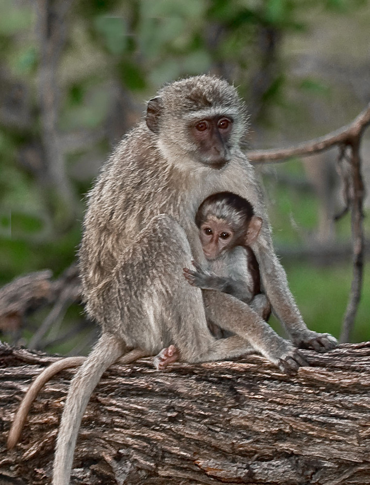 Two views of the same Vervet mother & baby (about 6 weeks). It is always amusing to watch the youngsters scamper around and play with their peers.[Botswana]....