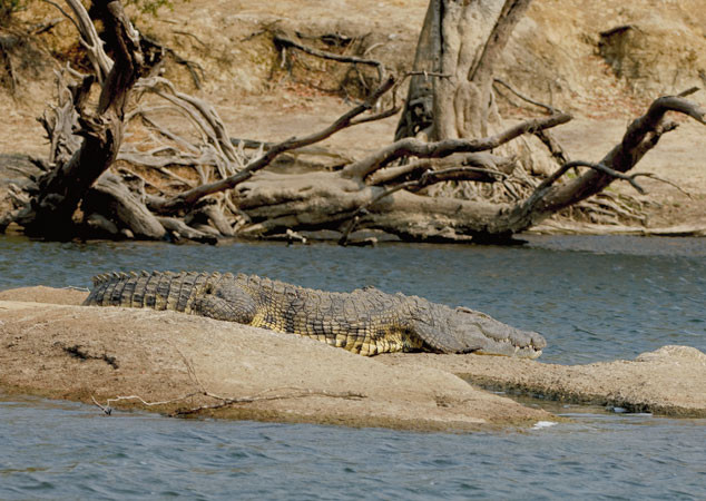 Crocodile Sun Bathing: This is a large crocodile (12 feet) resting on a rock. [Lafupa River, Zambia].