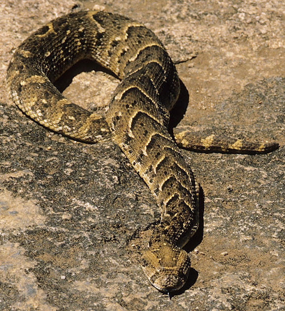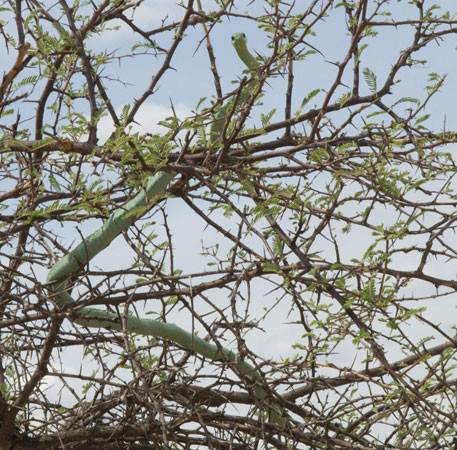The green color identifies this Boonslang as a rather large male. The female tends to be brownish. This one is about 8 feet long. It is a tree-dweller, and will lie on a branch of a large bush, waiting for some bird to alight. I have seen it attack bird nests for the eggs. It is very poisonous and, therefore, extremely dangerous, because it hides amongst the folliage from which it can strike without being seen. [Botswana].