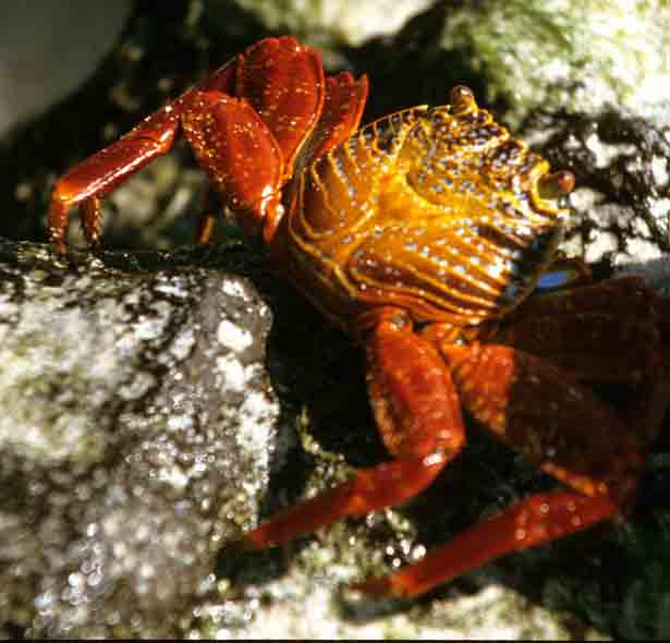 A close-up of a Sally Lightfoot Crab, an abundant scavenger, found throughout the islands. [Galapagos Islands].