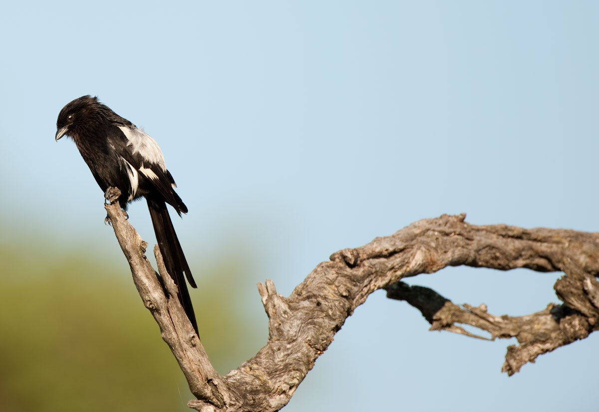 The Longtailed Shrike is a small black bird with some white patches and a very long tail. It is frequently seen in groups of 6 or more. [Moremi NP, Botswana].