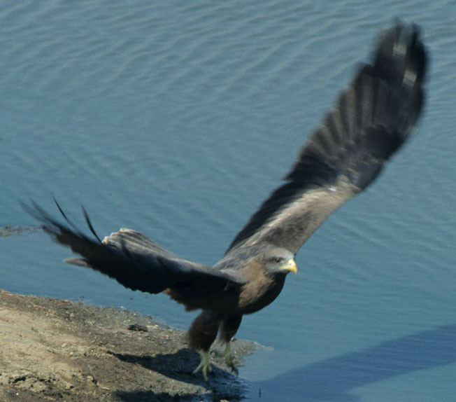 1st image: Two minutes before this picture was taken, this Yellowbilled Kite and its mate were perched in a small tree about 300 feet away from the water, where there was a large flock of doves on the sand drinking at water's edge. Suddenly, this pair of Yellowbilled kits each dove into the flock of doves and each hit one. In seconds, each had demolished a dove, leavimg only some scattered feathers. (Please see next image). [Masuma Dam, Hwange NP, Zimbabwe].