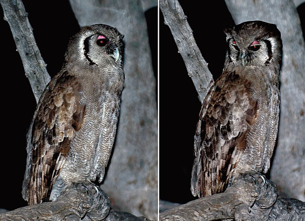 This picture of a Whitefaced Owl was taken at night with flash. Its food is rodents (incl. small squirrels), small mongooses, dove-sized birds, and insects, [South Zambezi NP, Zambia].