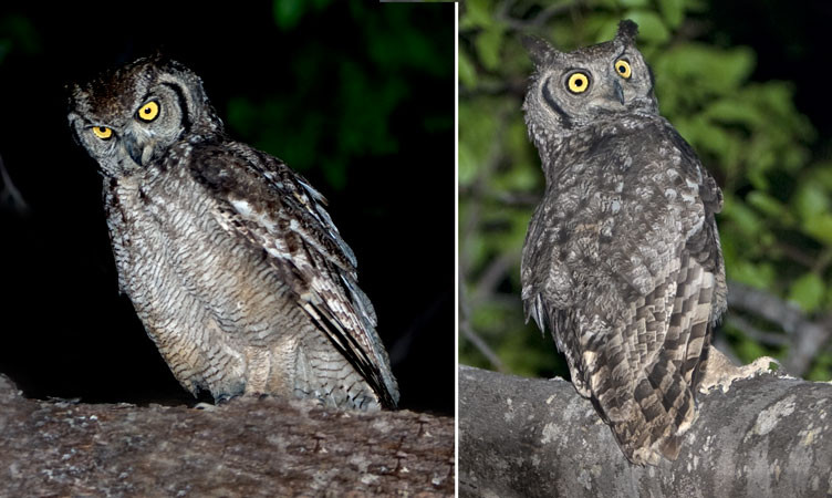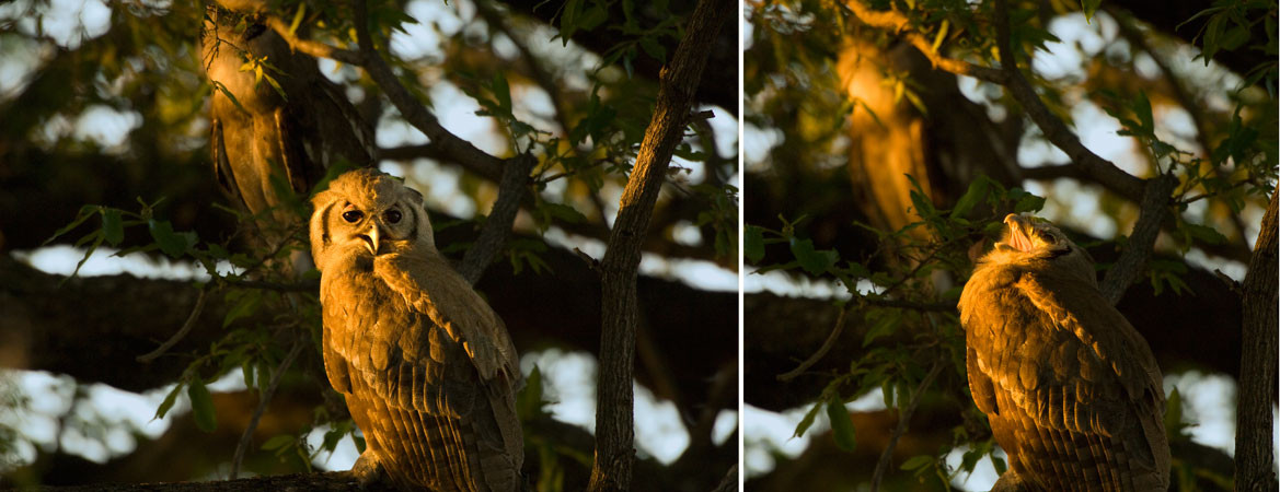 A double image of a 7-8 month Verreaux's Eagle Owl chick. Its mother can be partially seen on a limb behind it. Probably, the hungry chick is calling to the father to hurry back with something to eat. Chicks usually stay with their parents for about a year. (Please see captions on previous images). [Xakanaka, Botswana].