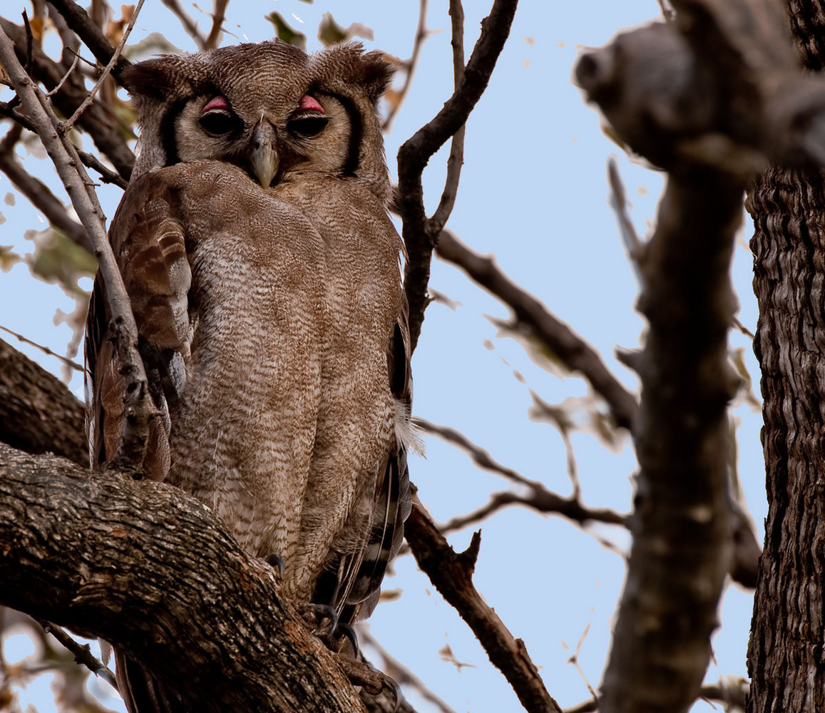 A Verreaux's Eagle Owl (also called Giant Eagle owl) is the largest of the African owls, but its size varies in different areas. A large individual like this might prey on mongooses, and even newborn gazelles. It is readily identified by the red color of its upper eyelids. [Serengeti, Tanzania].