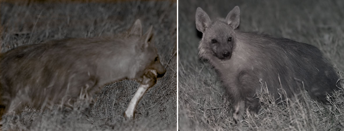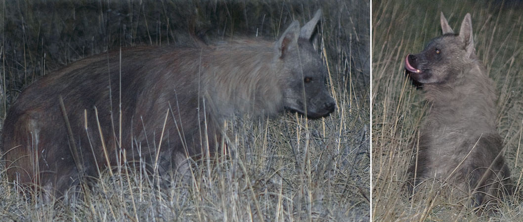 A double image of a Brown Hyena in the dry grass: The same animal as previous. All of these night images were taken with flash. (Please consult 1st caption). [Jack's Camp, nr Central Kalahari, Botswana].